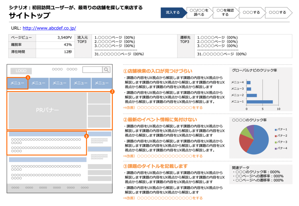 | ④サービス詳細 | PV / UU / 滞在時間遷移元 / 遷移先UIのクリック率直帰率CVポイントへの遷移率 |