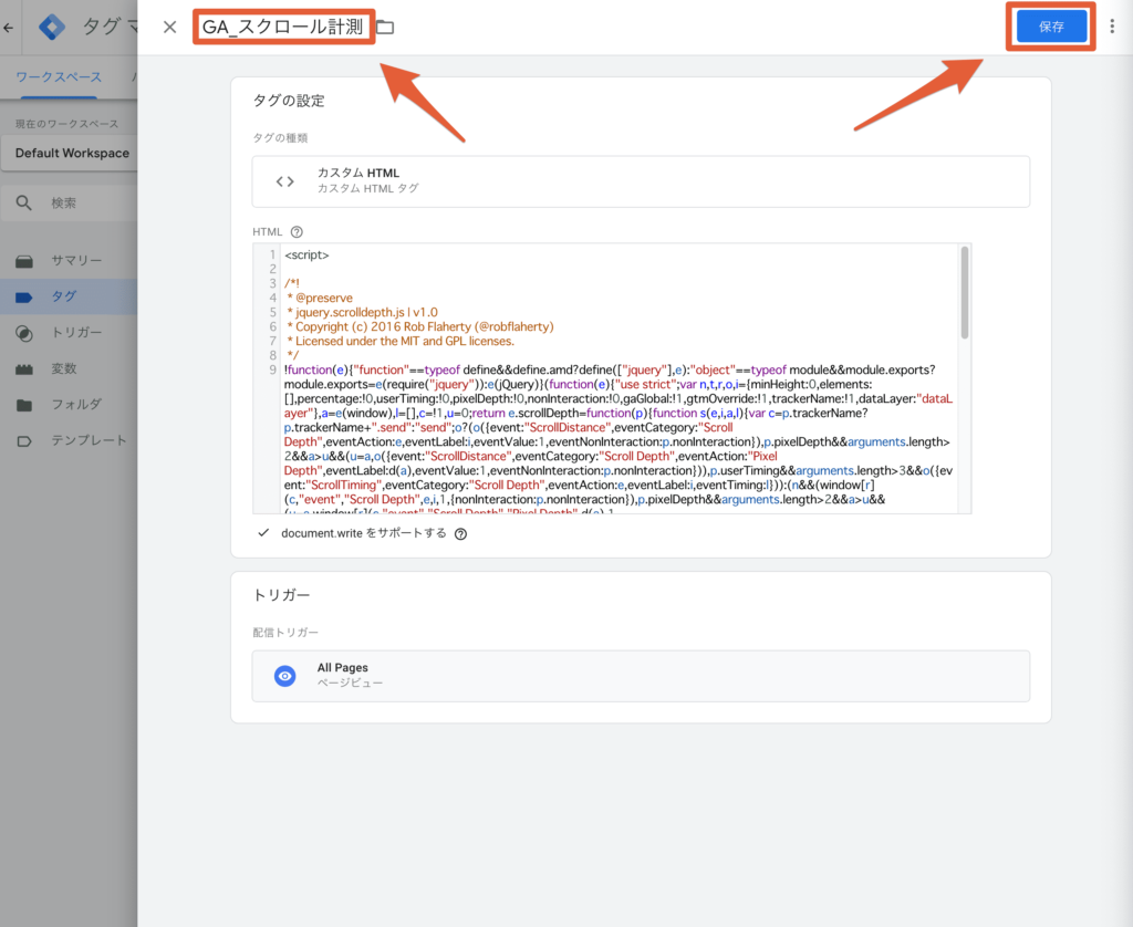 解析ツールの導入などでコードを追加する際に個別にHTMLソースをいじらなくても、GTMから一括ですべてのページのタグを確認・変更することが可能になる。